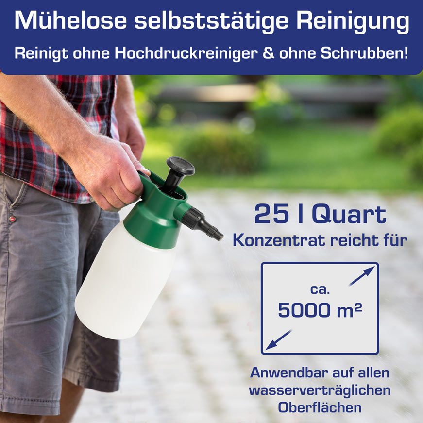 Eine biologisch abbaubare Flechten, Algen oder Grünbelagsentfernung von zb. Dachziegel oder Pflasterstein ist sehr wichtig, um Folgeschäden zu vermeiden. Als Spezialist für nachhaltige Reinigungsmittel im Bereich Immobilien, mit über 20 Jahren Erfahrung haben wir erkannt, dass der Erhalt von Sachwerten durch die Reinigung und den Schutz der Gebäudehülle – z.b Ihres Hausdaches oder Ihrer Hofeinfahrt – von Eigentümern manchmal unterschätzt aber oft gewünscht wird. Deswegen haben wir eigene biologisch abbaubare Algen, Flechten und Grünbelagsentferner entwickelt, die den Wünschen nach nachhaltigen und dennoch wirksamen Entfernung von Grünbelägen unserer Kunden entsprechen!
